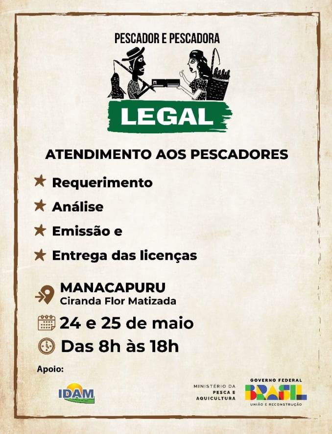 O Governo Federal vai lançar na próxima sexta-feira (26), no auditório Eulálio Chaves, na Universidade Federal do Amazonas (Ufam), a campanha Pescador Legal. O evento contará com a presença do ministro da Pesca e Aquicultura André de Paula que também irá participar do mutirão de cadastro e recadastramento no município de Manacapuru (distante 100 km da capital), acompanhado do deputado federal Sidney Leite, que defende desde o início um processo mais acessível aos pescadores que moram em áreas remotas.