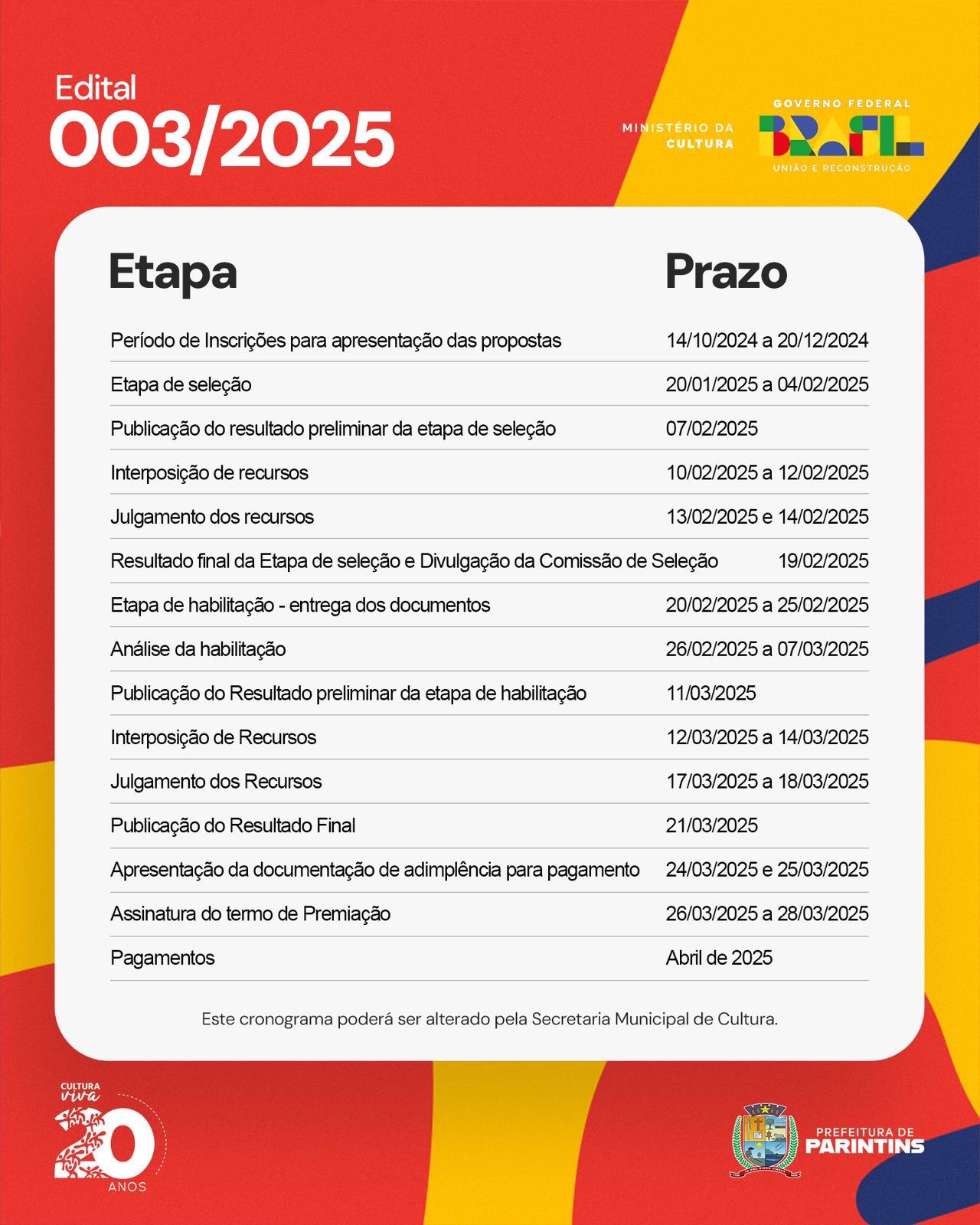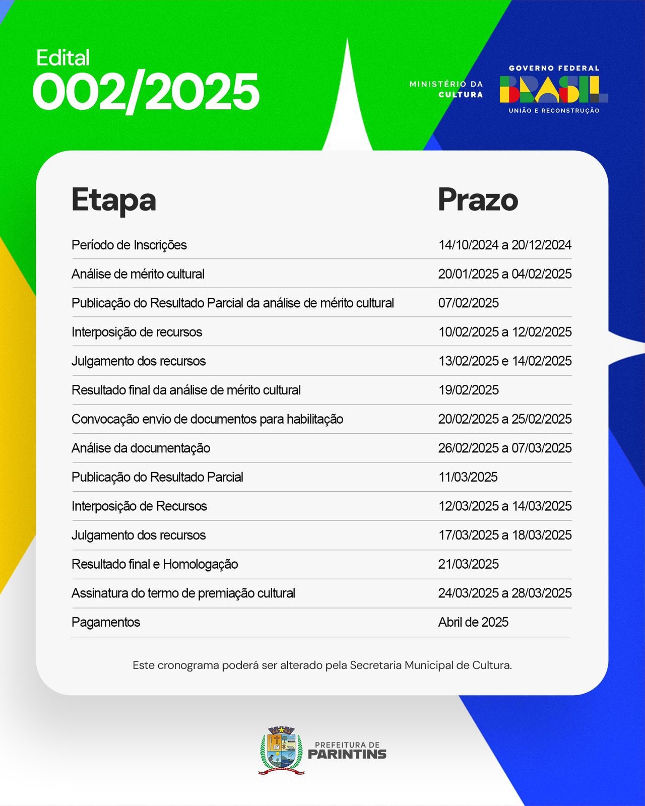 Para o edital de Chamamento Público n° 002/2024 “Prêmio Para Mestres, Mestras e Fazedores de Culturas Populares e Tradicionais” o cronograma é o seguinte: no dia 19 de fevereiro acontece a publicação do resultado final; de 20 a 25 é o prazo para envio de documentos para habilitação; dia 23 de março acontece a homologação do resultado final e de 20 a 24 será a assinatura do Termo de Premiação Cultural.