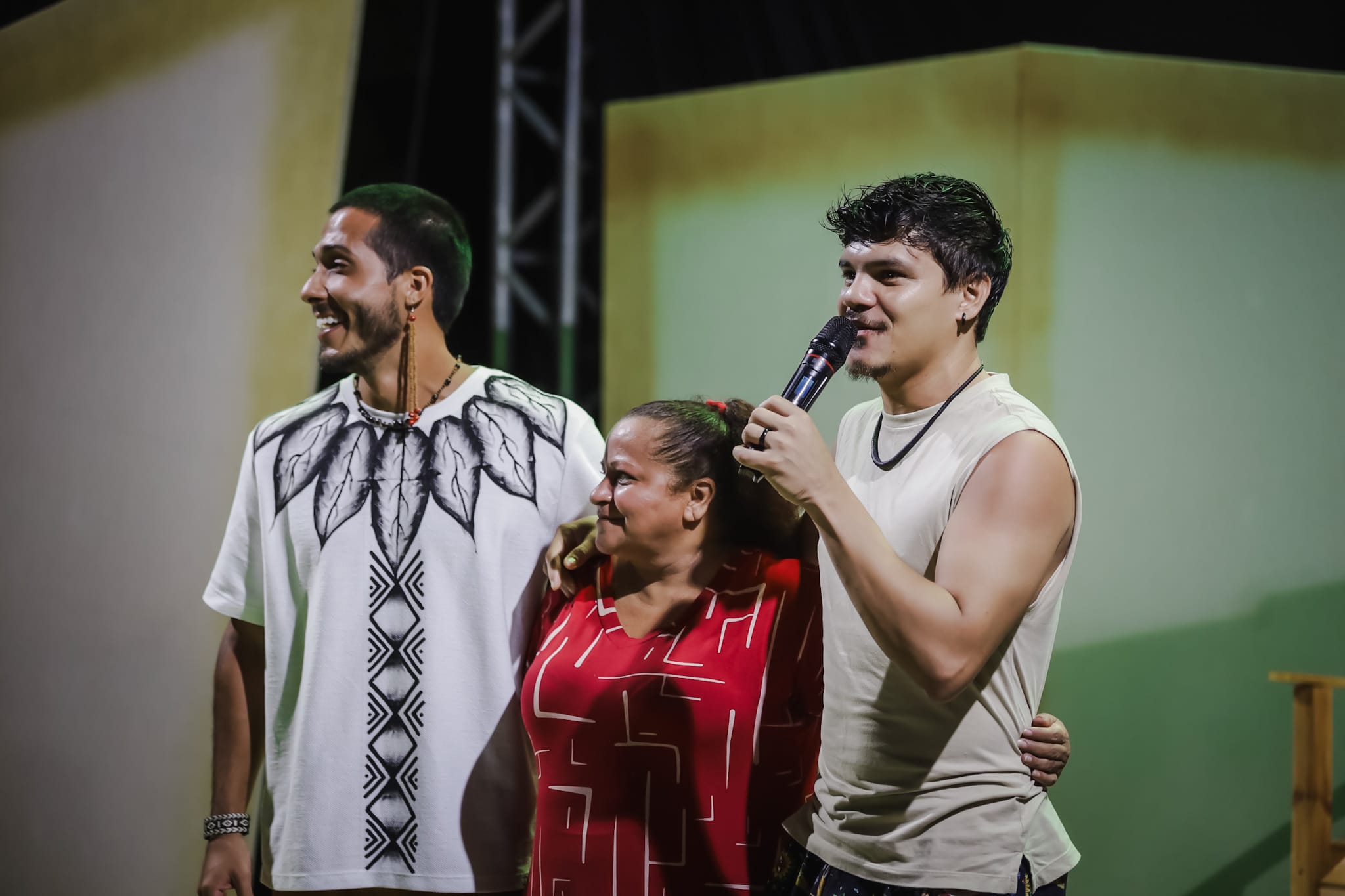 O teatro na floresta teve direito a cenário montado às margens do Rio Cuieiras, trilha sonora original interpretada ao vivo e figurino assinado pelo estilista indígena Maurício Duarte. No palco, os jovens atuaram e cantaram suas histórias, seus sonhos e seus desejos, em noite de festa na comunidade Três Unidos, terra dos Kambeba.