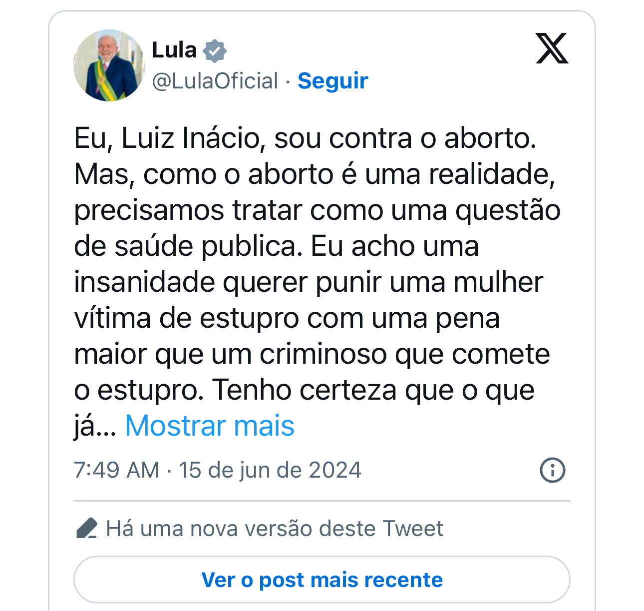 O presidente Luiz Inácio Lula da Silva se pronunciou na manhã deste sábado (15/6) contra o projeto de lei que aumenta a pena para quem comete aborto, em discussão no Congresso. Lula disse ser contra o aborto, mas que é uma “insanidade querer punir uma mulher vítima de estupro com uma pena maior que um criminoso que comete o estupro.”