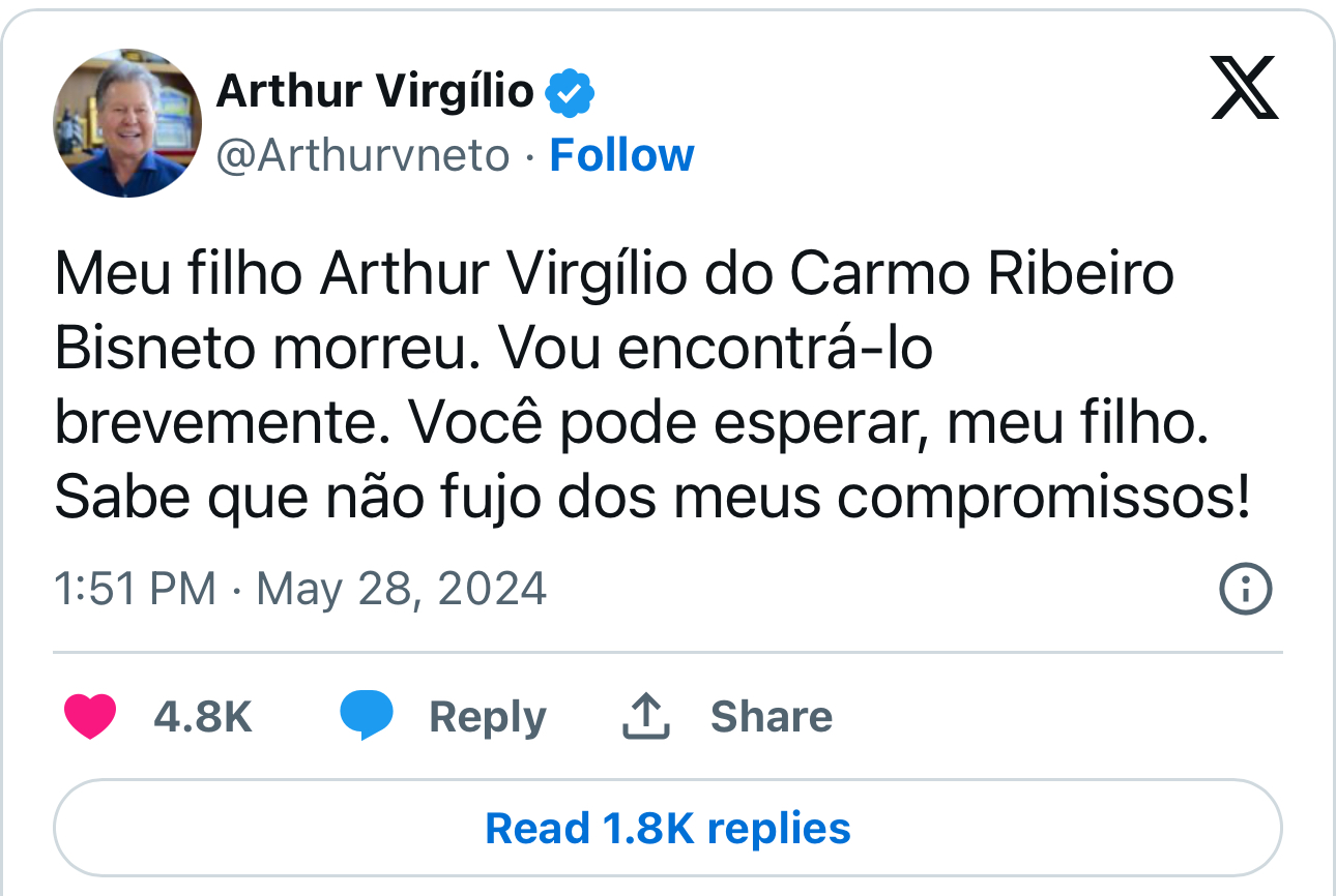 A informação foi confirmada pelo próprio pai, o ex-prefeito de Manaus e ex-senador Arthur Virgílio Neto, 78 anos, em postagem nas redes sociais