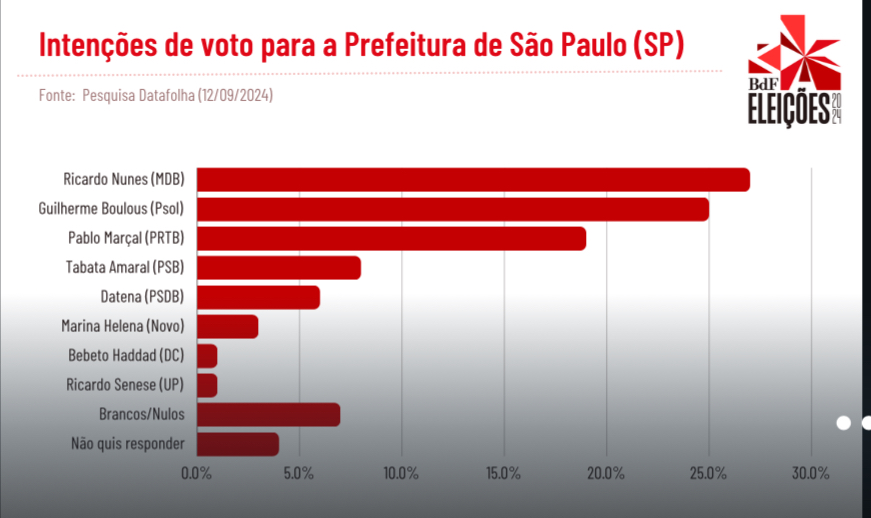 Pesquisa Datafolha divulgada nesta quinta-feira (12) mostra uma mudança de cenário na disputa pela prefeitura de São Paulo em relação ao levantamento anterior. O atual prefeito da cidade, Ricardo Nunes (MDB), aparece na liderança com 27%, empatado tecnicamente com Guilherme Boulos (Psol), que tem 25%. Já o coach Pablo Marçal (PRTB) está com 19%.