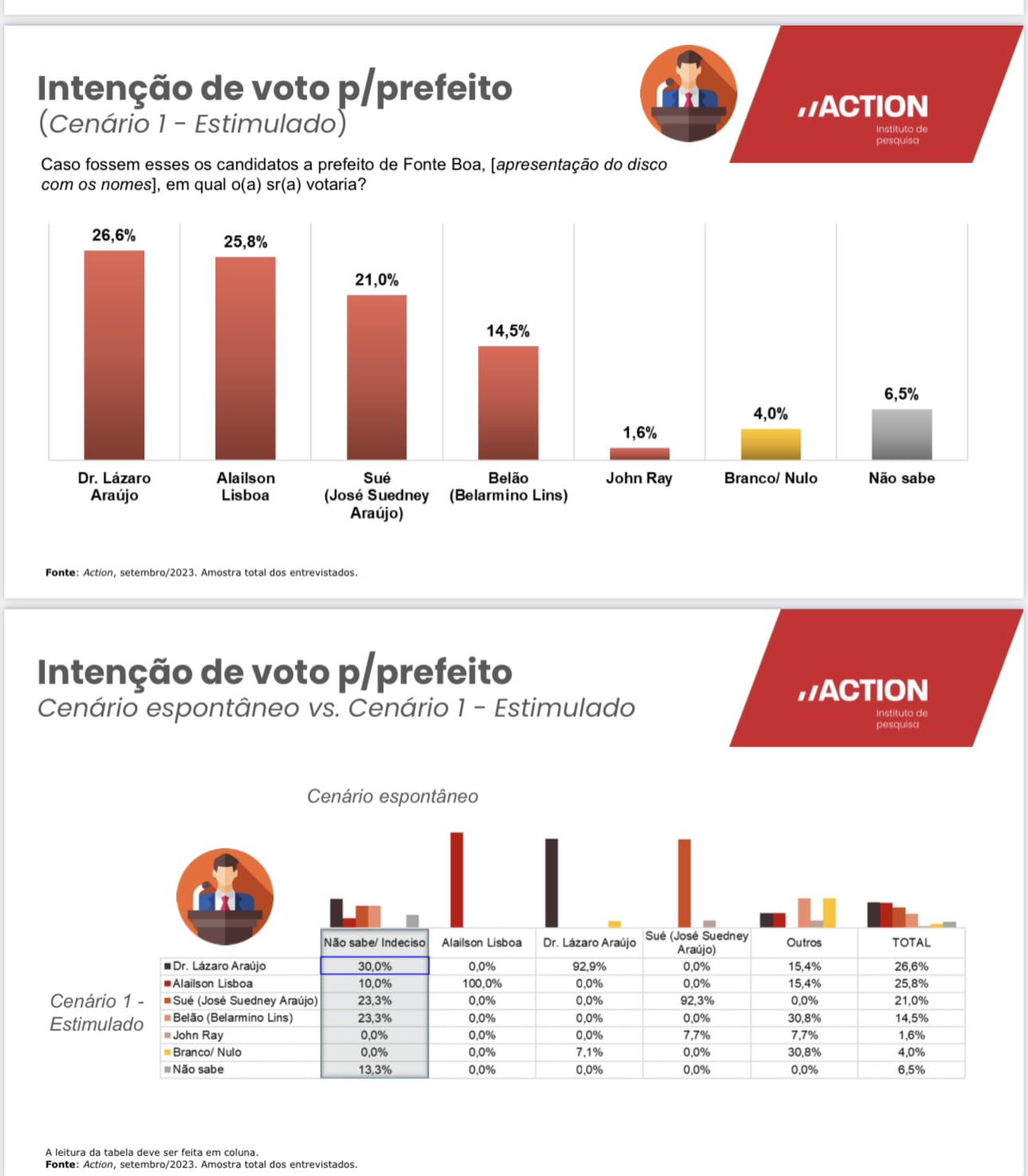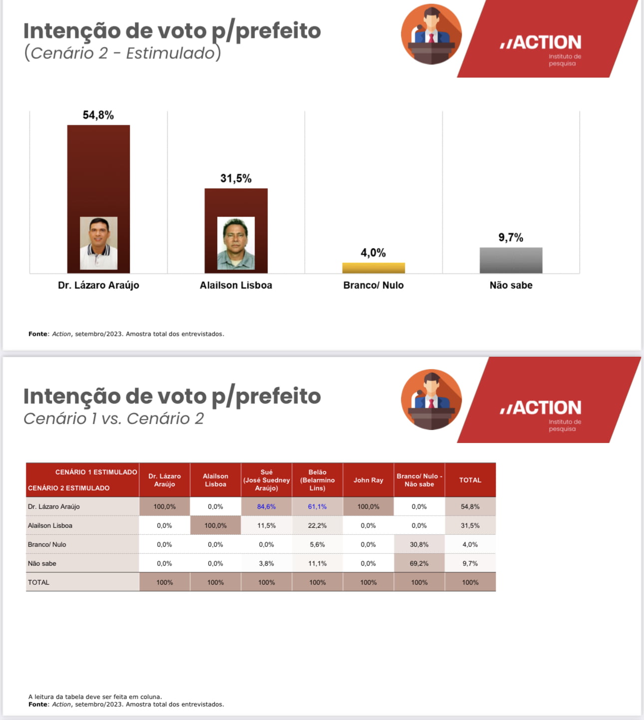 O levantamento feito Instituto Action aponta uma desaprovação de 57,2% da gestão do atual e se caso o prefeito decidisse apoiar a candidatura de Dr. Lázaro, os números captados dos eleitores seriam: