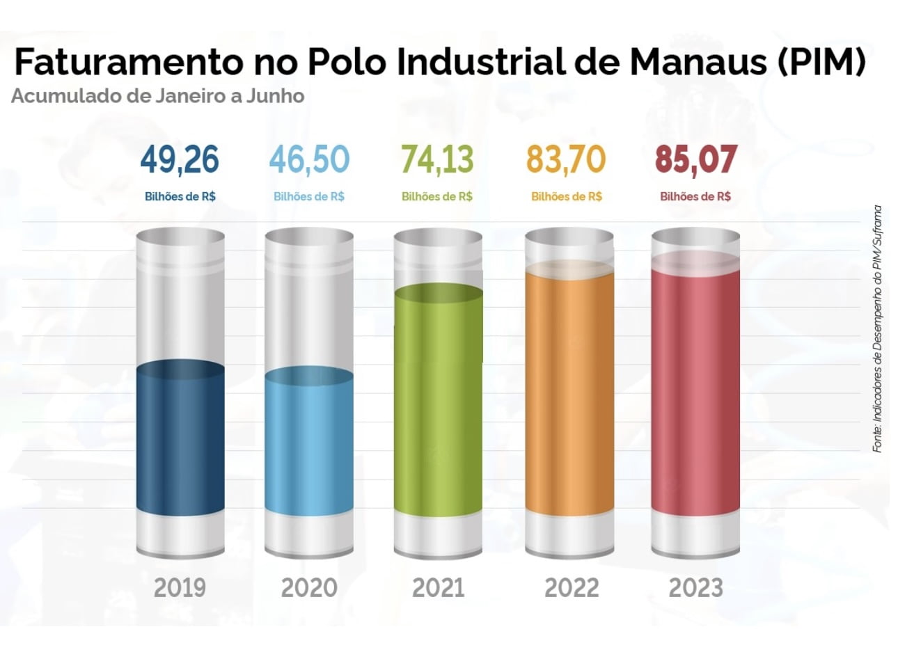 No primeiro semestre deste ano, o Polo Industrial de Manaus (PIM), composto por aproximadamente 500 empresas, registrou faturamento de R$ 85,07 bilhões e alcançou crescimento de 1,64% na comparação com o mesmo intervalo de 2022 (R$ 83,70 bilhões). Em dólar, o faturamento do PIM totalizou o montante de US$ 16.83 bilhões, o que indica aumento de 0,22% ante igual período do ano passado (US$ 16.79 bilhões).