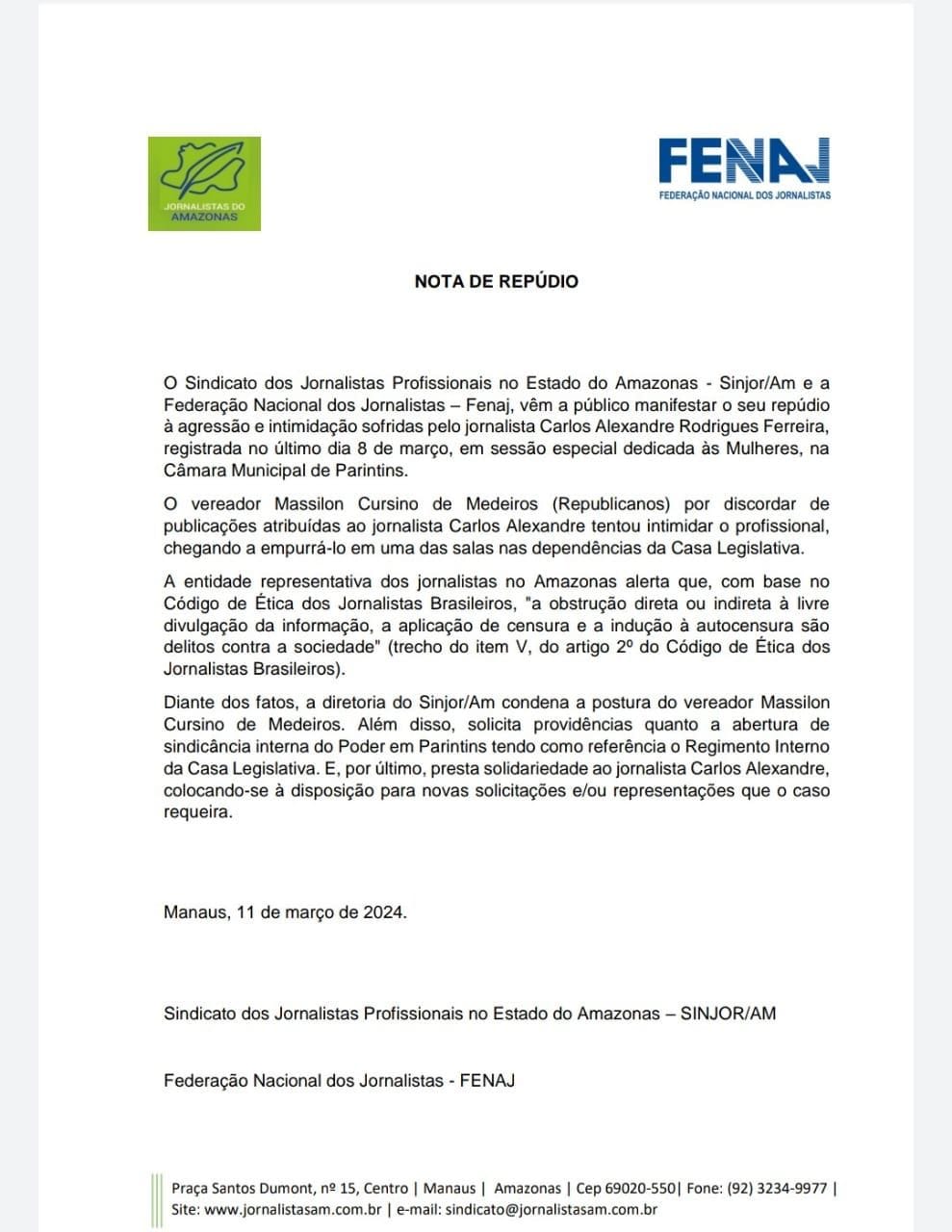 MANAUS, AM – O Sindicato dos Jornalistas Profissionais no Estado do Amazonas (Sinjor/Am) e a Federação Nacional dos Jornalistas (FENAJ) emitiram nota conjunta de repúdio após o jornalista Carlos Alexandre Rodrigues Ferreira ser alvo de intimidação durante o exercício de sua profissão na Câmara Municipal de Parintins, no último dia 8 de março.