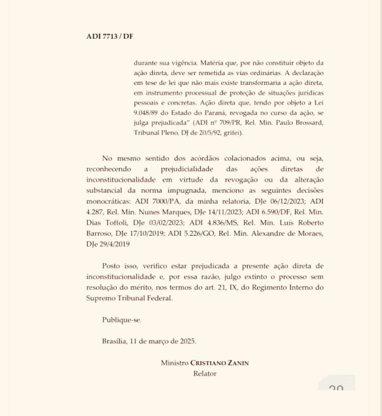 Em sua decisão, Zanin destacou que, diante da revogação das normas contestadas e da realização da nova eleição, a ADI perdeu objeto, tornando-se desnecessário o julgamento do mérito.