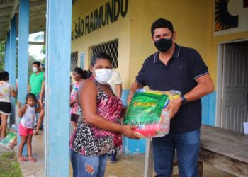 As cestas são levadas em uma embarcação por uma equipe da Semasth que visitam as comunidades com assistentes sociais e ...