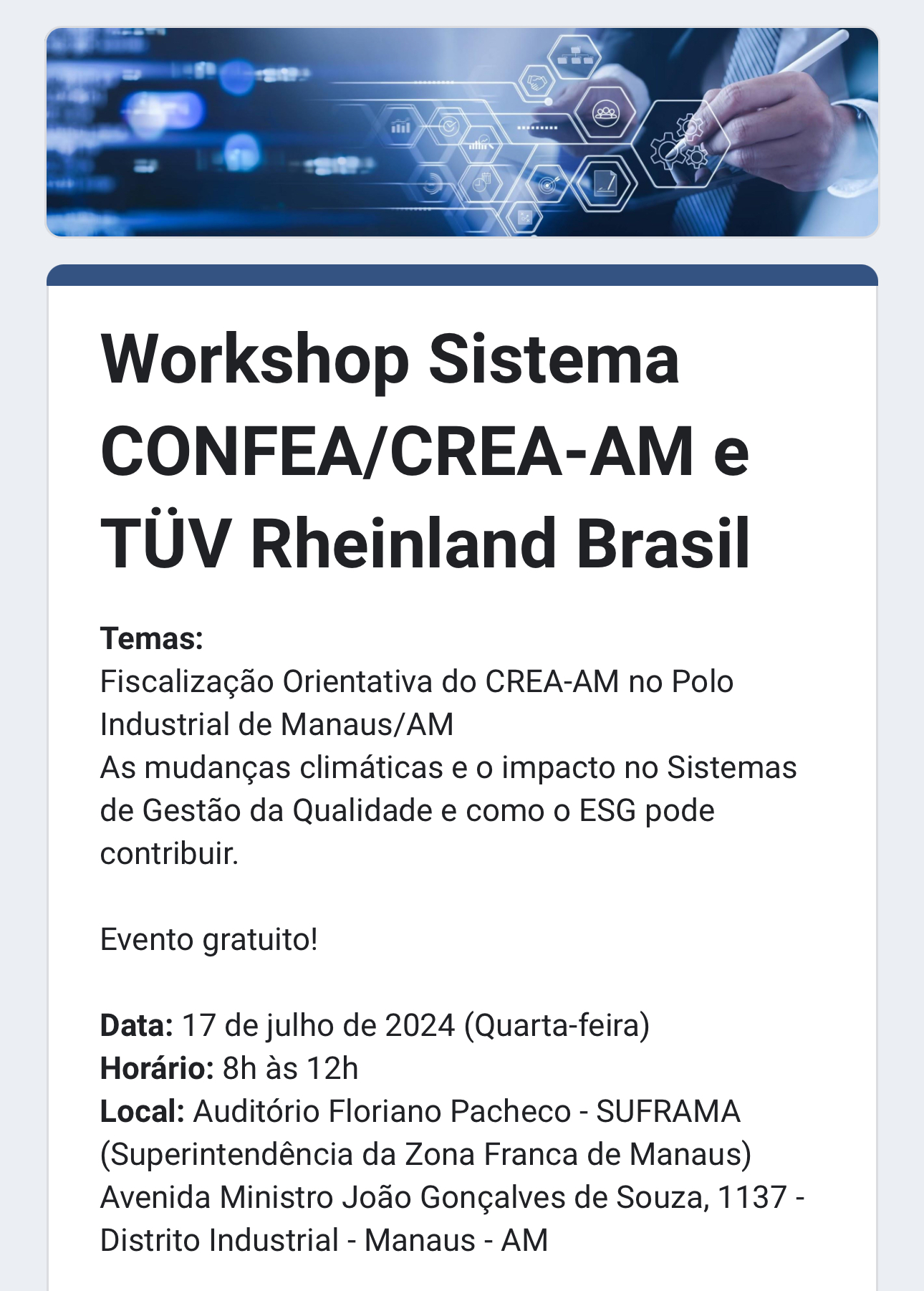 O Conselho Regional de Engenharia e Agronomia do Amazonas (Crea-AM), em parceria com a empresa alemã TÜV Rheinland, promoverá de forma gratuita o Workshop Sistema Confea/Crea-AM e TÜV Rheinland Brasil, com o tema “Fiscalização Orientativa do Crea-AM no Polo Industrial de Manaus–AM”, nessa quarta-feira, 17/07, das 8h às 12h, no auditório da Superintendência da Zona Franca de Manaus (Suframa), localizado na avenida Ministro Mário Andreazza. As inscrições gratuitas podem ser realizadas pelo link: https://encurtador.com.br/wPaay